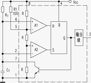 555时基电路常用于制作定时器,电路如图所示。虚线框内部分是555时基电路内部功能原理图。当②脚电位低于1/3Vcc时,③脚输出高电平,当⑥脚电位高于2/3Vcc时,③脚输出低电平。作定时器用时,通常是利用电容CT从0充电到2/3Vcc这段时间,或从2/3Vcc放电到1/3Vcc这段时间作定时时间。要使定时时间延长,必须增大RTCT的值,RTCT的值过大,定时时间不够精确。