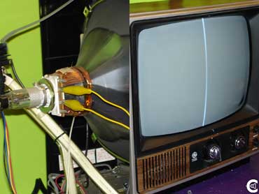 This step is kind of dangerous, and there are two ways to accomplsh it, the easy way, and the safer way. I will only cover the safe way. First clip and strip all four of the wires going to the tube, then connect them all back up using alligator clips. Then, remove one of the clips, and turn the telvision on. If you get a vertical line, then the disconnected wire is one of the horizontal drive wires, if you get a horizontal line, then you disconnected a vertical wire. Turn the television back off, then follow the same process for the other three wires to determine which direction each controls. |