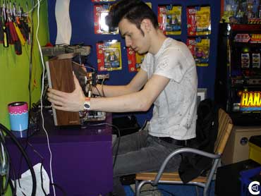 Finally, drill two holes in the simulated wood grain, and attach the switch, and audio jack to the holes. Now, plug it in, and crank up the tunes. |