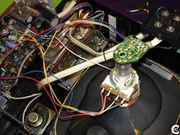 The diagram to the left shows how to run the wires, as I stated before, this TV is a type three, so, the wiring will be slightly altered. First, connect the horizontal lines coming from the tv board to one set of inputs on the switch. Next, wire the vertical lines coming from the board to the other set of inputs on the switch. Then, wire the two outputs of the switch to the vertical inputs on the tube. Once the switch is wired up, you can now connect the audio input. The audio jack we used is a mono 1/4" type. You then connect the positive and negative lines on the jack to the two horizontal inputs on the tube. Normally the way you connect the audio jack to the tv tube does not matter, however, in some cases, it does matter. When that happens, the tv will display nothing, or very little, so, just switch the way the wires are connected to the tube. |