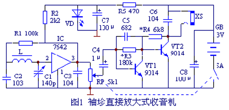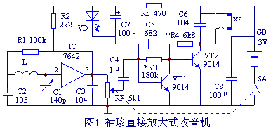 S2107型袖珍收音机是一款适合初学者装配学习的简易型收音机,其工作方式为直接放大式,它的工作方框图见图4-2-1。从天线接收进来的许多电台的高频信号,通过输入调谐回路选择,使得只有我们需要的那个台才能顺利进入下一级;由输入回路传输过来的高频信号是极其微弱的,还必须进行足够的放大,这叫高频放大,简称高放。高频信号放到足够大了,是不是就行了呢?也不行。下一步还要进行检波,检波的目的是把调制在高频载波上的低频信号取下来。检波后的信号同样是很微弱的,最后还要经低频放大再送到耳机还原成声音。 ![]() 图1是S2107型袖珍式收音机的电原理图。 ![]() 由图可见,磁性天线L、可变电容C1及电容器C2组成了输入调谐回路,负责收集电磁波和选择台。 ![]() TA7642是一只微型集成电路,外形和TO-92封装的三极管(如9014)相同(见图4-2-3)。别看它体积很小,它的内部却集成了10只三极管,包括三级高放、一级检波和一级低频缓冲放大。 TA7642的后面又接了两级低放,由VT1、VT2组成。VT2的集电极接耳机BE,将低频电流转换为声音。电位器RP用来控制音量的大小。R5与发光二极管VD组成,简单的稳压电路,取得1.8V的稳定电压,供TA7642。 整机采用两节5号电池,装在一个20×55×90mm3的塑料小盒中,十分小巧玲珑。