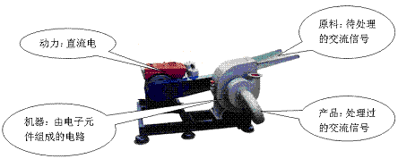 关于交、直流电在我们电子技术里的应用,我们可以做如下比喻,把元器件组成的电路比作一台加工机器,那么直流电就是让机器运作起来的动力源(电动机或柴油机)而交流电是我们生产的原料。我们学习电子技术就是为了能正确的操作这台机器,让机器生产出我们想要的产品。参考图如下