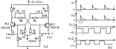 | ic1越来越小,ic2越来越大,最后到达BG1截止、BG2导通;接差触发脉冲方波从2端输入,并在t=t2时,有正尖脉冲作用于导通管BG2的基极,又经过正反馈过程,使BG1导通,BG2截止。以后,在1、2端的触发脉冲的轮流作用下,双稳电路的状态也作用相应的翻转,如图一(b)所示。 |