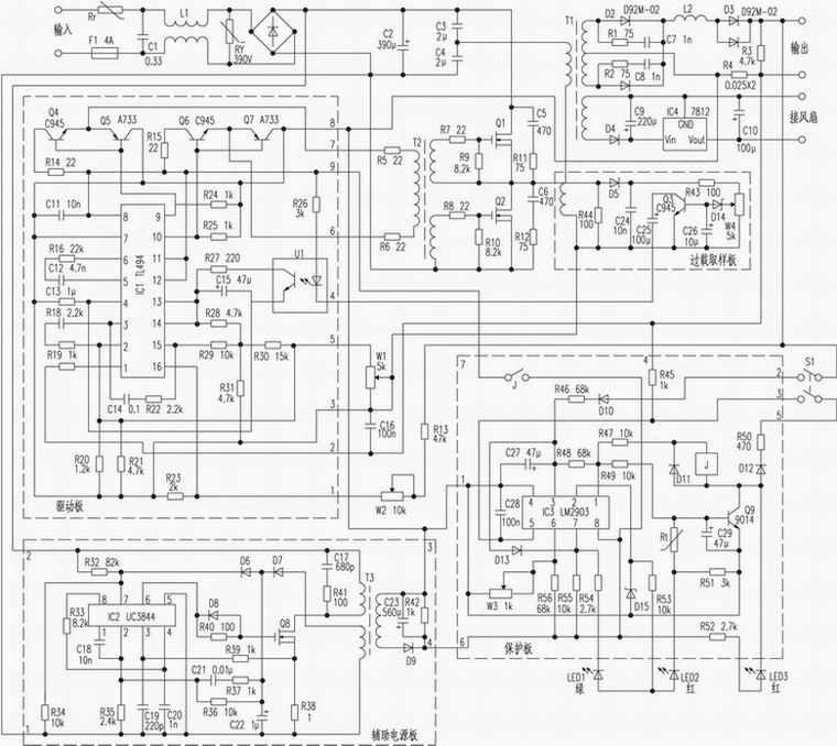 市电从主板输入,经整流滤波后作本机主电源。变压器T1、T2与Q1、Q2等构成高频功率变换电路。D2、D3、L2为高频整流及输出隔离元件,D4、IC4等为散热风扇提供12V电源。辅助电源模块为整机提供12V直流工作电源,它以UC3844作脉宽调制,Q8(K1204)、T3等组成功率变换,经D9、C23整流滤波后从该板③、④脚输出12V直流电源。R33、C20决定UC3844的工作频率,本电路工作频率约为200kHz,R38为该电源的电流取样电阻,其压降经R39馈给IC2的③脚,超过1V时即关闭本电源。IC2⑦脚为电源端,开机时+300V经R32为IC2提供电源,电路工作后由D6、D7、C22提供工作电源。