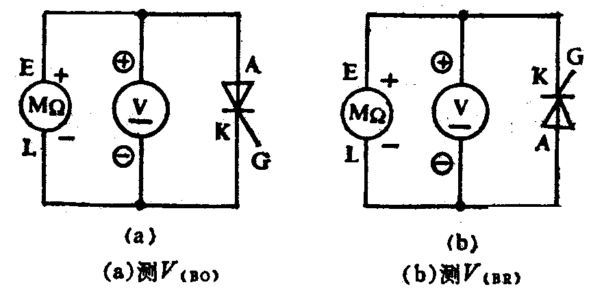 式中,VRRM、V(BR)均取绝对值,下同。 因此,只要测出V(BO)、V(BR)之值,就进一步求出VDRM和VRRM。一般情况下,正、反向断态峰值电压在数值上基本相等。