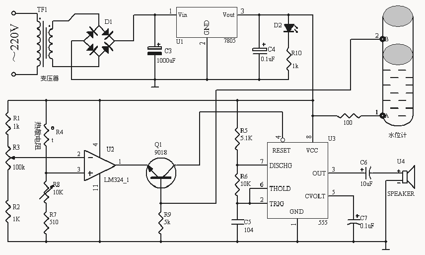 电路分析说明:热敏电阻R4随着温度的升高阻值减小,引起R4和R8之间的电压上升;R1、R2、R3组成分压电路提供参考电压,调节R3可以改变参考电压值;运放LM324构成电压比较器,反向输入参考电压,正向输入信号电压(随温度改变的电压),当信号电压超过参考电压时,输出由低电平翻转成高电平;555定时器产生报警用的音频信号,直接驱动喇叭发声,调节R5、R6、C5的值可以改变音调,由复位端4脚控制是否发声(低电平复位、高电平或悬空时发声);555定时器复位端(4脚)和运放输出端之间用NPN三极管9018隔开,9018基极接水箱上的水位计,有水时A、B两点导通,使得9018基极接电源高电平,三极管导通,LM324输出低电平使555不发声,如果水箱里没水,9018基极由R9接地,截止,555复位脚悬空,喇叭报警,可以防止干烧,温度升高到设定值时,324输出高电平,使得555复位端电平抬高,喇叭发声报警,提醒用户停电,9018在此构成权限控制电路;电源由变压器(VC-9V)通过二极管桥式整流电容滤波后经7805稳压提供5V电压供电。在实际使用时我将热敏电阻贴在水箱外壁上,根据个人爱好调节R3,设定水温。 555内部结构和引脚如图所示