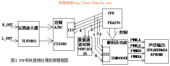 根据上文所述,作者给出涉及对FM Radio音频处理的电路原理框图如图3所示:FM Module出来的音频信号R_OUT、L_OUT经过运放及其他滤波、工作点移动等处理电路进入CS5340,信号经过A/D转换成IIS数字信号,其中运放的作用主要是实现阻抗转换。此时的IIS数据通信如图3中的方向线1、2、3、4、5、6所示:其中1、2、3为CPU的IIS控制器给CS5340及S5M0064X的IIS接口提供的时钟信号即IIS的位时钟、同步时钟、系统时钟(具体说明读者可以参看相关资料)。其中线4是从CS5340输出的音频串行数据流,这个数据流一方面可以通过CPU的IIS数据输入口进入系统来实现FM数字节目录制。另一方面可以经74LVC2G125提供给S5M0064X芯片。线5为从CPU输出的音频数据流,这个数据流可以是系统中MP3或MPEG4等文件解码出来的音频数据,它也可以通过74LVC2G125提供给S5M0064X来输出到发声设备。线6即为线4和线5的切换结果,即当用户需要听FM时就切换数据流4,用户需要听系统中其他数据媒体时就切换到数据流5。此外,S5M0064X为集成D类功放的音频解码芯片,CPU可以对它进行音量调节及其他控制等一系列操作,声音则可以从如图3中的四路PWM输出到扬声器(SPEAKER)或EARPHONE(耳机)中去。