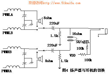 图3中声音输出部分可以粗略的采用如图4的电路来实现,其中PWMLA和PWMLB、PWMRA和PWMRB分别可以实现BTL(桥式连接)方式来驱动立体声SPEAKER。通过节点切换(这个切换可以通过音频模拟开关如ADG836来实现),PWMLB、PWMRB可以以SE(单端)方式驱动立体声耳机。图4中的SE/nBTL既可以作为ADG836的切换信号也可以为CPU提供耳机插入信息。