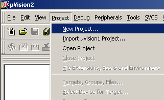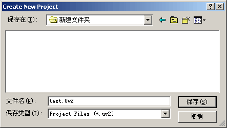 (1)点击Project菜单,选择弹出的下拉式菜单中的New Project,如图1-2。接着弹出一个标准Windows文件对话窗口,如图1-3,这个东东想必大家是见了N次的了,用法技巧也不是这里要说的,以后的章节中出现类似情况将不再说明。在"文件名"中输入您的第一个C程序项目名称,这里我们用"test",这是笔者惯用的名称,大家不必照搬就是了,只要符合Windows文件规则的文件名都行。"保存"后的文件扩展名为uv2,这是KEIL uVision2项目文件扩展名,以后我们可以直接点击此文件以打开先前做的项目。