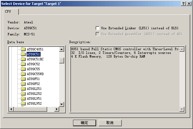(2)选择所要的单片机,这里我们选择常用的Ateml公司的AT89C51。此时屏幕如图1-4所示。AT89C51有什么功能、特点呢?不用急,看图中右边有简单的介绍,稍后的章节会作较详细的介绍。完成上面步骤后,我们就可以进行程序的编写了。