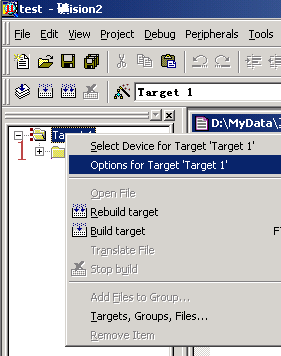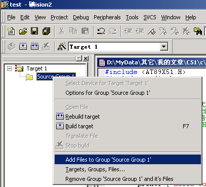 (4)点击图1-5中的3保存新建的程序,也可以用菜单File-Save或快捷键Ctrl+S进行保存。因是新文件所以保存时会弹出类似图1-3的文件操作窗口,我们把第一个程序命名为test1.c,保存在项目所在的目录中,这时你会发现程序单词有了不同的颜色,说明KEIL的C语法检查生效了。如图1-6鼠标在屏幕左边的Source Group1文件夹图标上右击弹出菜单,在这里可以做在项目中增加减少文件等操作。我们?quot;Add File to Group 'Source Group 1'"弹出文件窗口,选择刚刚保存的文件,按ADD按钮,关闭文件窗,程序文件已加到项目中了。这时在Source Group1文件夹图标左边出现了一个小+号说明,文件组中有了文件,点击它可以展开查看。