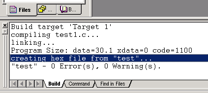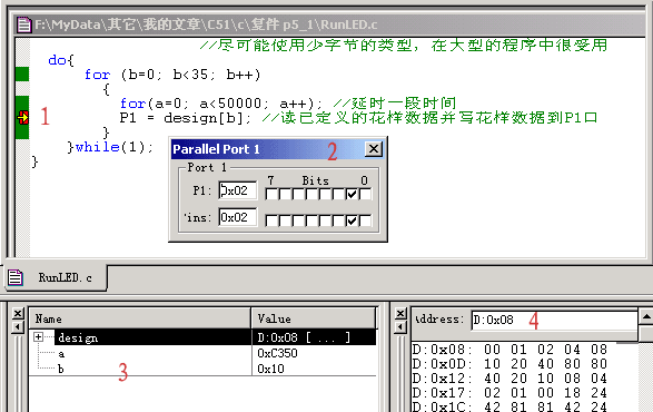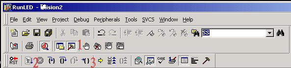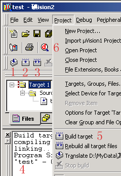 (5)C程序文件已被我们加到了项目中了,下面就剩下编译运行了。这个项目我们只是用做学习新建程序项目和编译运行仿真的基本方法,所以使用软件默认的编译设置,它不会生成用于芯片烧写的HEX文件,如何设置生成HEX文件就请看下面的第三课。我们先来看图1-7吧,图中1、2、3都是编译按钮,不同是1是用于编译单个文件。2是编译当前项目,如果先前编译过一次之后文件没有做动编辑改动,这时再点击是不会再次重新编译的。3是重新编译,每点击一次均会再次编译链接一次,不管程序是否有改动。在3右边的是停止编译按钮,只有点击了前三个中的任一个,停止按钮才会生效。5是菜单中的它们,我个人就不习惯用它了。嘿嘿,这个项目只有一个文件,你按123中的一个都可以编译。按了?好快哦,呵呵。在4中可以看到编译的错误信息和使用的系统资源情况等,以后我们要查错就靠它了。6是有一个小放大镜的按钮,这就是开启\关闭调试模式的按钮,它也存在于菜单Debug-Start\Stop Debug Session,快捷键为Ctrl+F5。