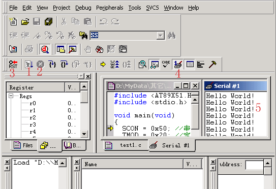 (6)进入调试模式,软件窗口样式大致如图1-8所示。图中1为运行,当程序处于停止状态时才有效,2为停止,程序处于运行状态时才有效。3是复位,模拟芯片的复位,程序回到最开头处执行。按4我们可以打开5中的串行调试窗口,这个窗口我们可以看到从51芯片的串行口输入输出的字符,这里的第一个项目也正是在这里看运行结果。这些在菜单中也有,这里不再一一介绍大家不妨找找看,其它的功能也会在后面的课程中慢慢介绍。首先按4打开串行调试窗口,再按运行键,这时就可以看到串行调试窗口中不断的打?quot;Hello World!"。呵呵,是不是不难呀?这样就完成了您的第一个C项目。最后我们要停止程序运行回到文件编辑模式中,就要先按停止按钮再按开启\关闭调试模式按钮。然后我们就可以进行关闭KEIL等相关操作了。