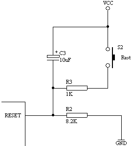 在振荡器运行时,有两个机器周期(24个振荡周期)以上的高电平出现在此引腿时,将使单片机复位,只要这个脚保持高电平,51芯片便循环复位。复位后P0-P3口均置1引脚表现为高电平,程序计数器和特殊功能寄存器SFR全部清零。当复位脚由高电平变为低电平时,芯片为ROM的00H处开始运行程序。常用的复位电路如图2-3所示。
