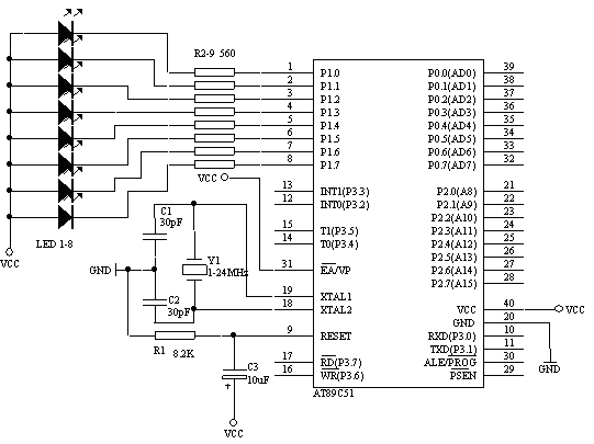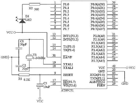 XTAL1是片内振荡器的反相放大器输入端,XTAL2则是输出端,使用外部振荡器时,外部振荡信号应直接加到XTAL1,而XTAL2悬空。内部方式时,时钟发生器对振荡脉冲二分频,如晶振为12MHz,时钟频率就为6MHz。晶振的频率可以在1MHz-24MHz内选择。电容取30PF左右。