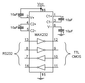 在制作电路前我们先来看看要用的MAX232,这里我们不去具体讨论它,只要知道它是TTL和RS232电平相互转换的芯片和基本的引脚接线功能就行了。通常我会用两个小功率晶体管加少量的电路去替换MAX232,可以省一点,效果也不错(如有兴趣可以查看http://www.cdle.net网站中的相关资料)。下图就是MAX232的基本接线图。