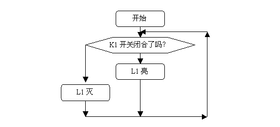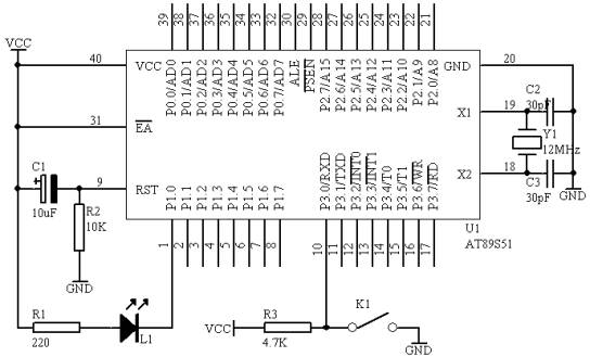 如图4.2.1所示,监视开关K1(接在P3.0端口上),用发光二极管L1(接在单片机P1.0端口上)显示开关状态,如果开关合上,L1亮,开关打开,L1熄灭。