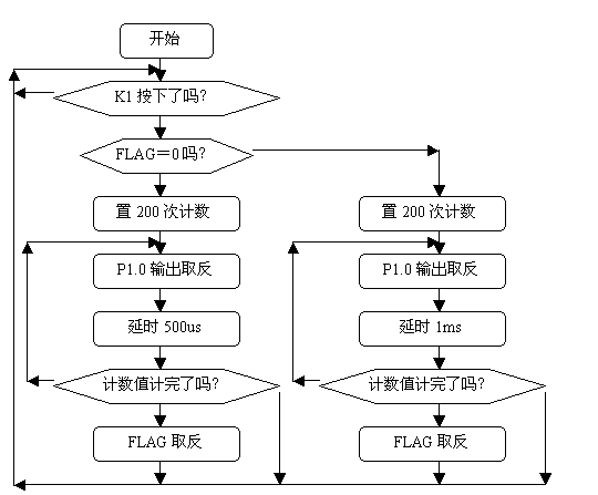 用P1.0输出1KHz和500Hz的音频信号驱动扬声器,作报警信号,要求1KHz信号响100ms,500Hz信号响200ms,交替进行,P1.7接一开关进行控制,当开关合上响报警信号,当开关断开告警信号停止,编出程序。