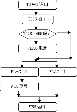 (2.       由于要产生上面的信号,我们把上面的信号分成两部分,一部分为1KHZ方波,占用时间为0.2秒;另一部分为电平,也是占用0.2秒;因此,我们利用单片机的定时/计数器T0作为定时,可以定时0.2秒;同时,也要用单片机产生1KHZ的方波,对于1KHZ的方波信号周期为1ms,高电平占用0.5ms,低电平占用0.5ms,因此也采用定时器T0来完成0.5ms的定时;最后,可以选定定时/计数器T0的定时时间为0.5ms,而要定时0.2秒则是0.5ms的400倍,也就是说以0.5ms定时400次就达到0.2秒的定时时间了。