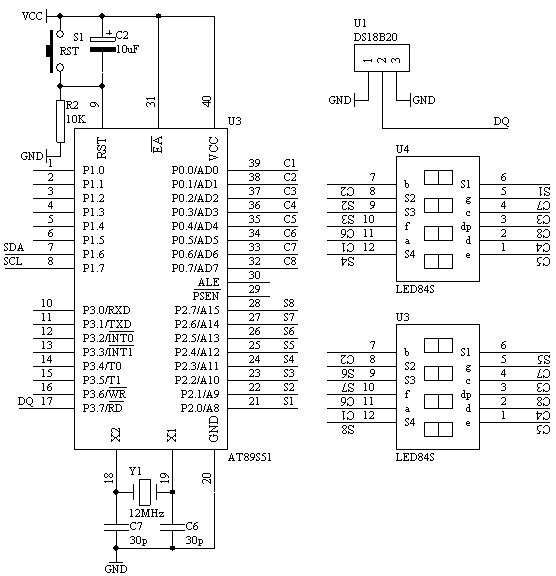 由于DS18B20采用的是1-Wire总线协议方式,即在一根数据线实现数据的双向传输,而对AT89S51单片机来说,硬件上并不支持单总线协议,因此,我们必须采用软件的方法来模拟单总线的协议时序来完成对DS18B20芯片的访问。