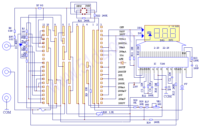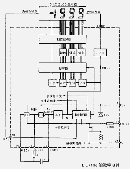 830B工作原理:该仪表的心脏是一片大规模集成电路,该芯片(7106)内部包含双积分A/D转换器,显示锁存器,七段译码器和显示驱动器,它的工作原理框图见示意图2。输入仪表的电压或电流信号经过一个开关选择器转换成一个0到199.9mV的直流电压。例如输入信号100VDC,就用1000:1的分压器获得100.0mVDC;输入信号100VAC,首先整流为100VDC,然后再分压成100.0mVDC。电流测量则通过选择不同阻值的分流电阻获得。