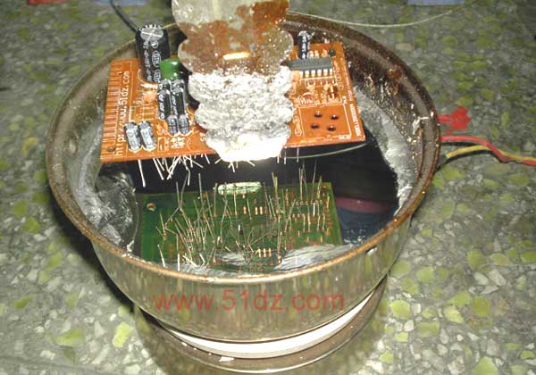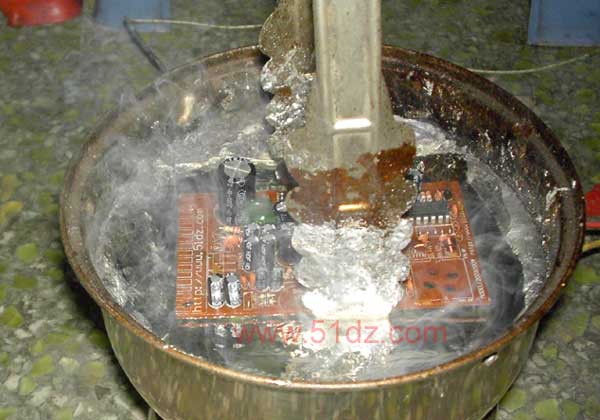 再将板放进熔化的锡炉,注意不要紧张,虽然下面有三百度的高温,但你的手在十几个厘米外,非常安全的。