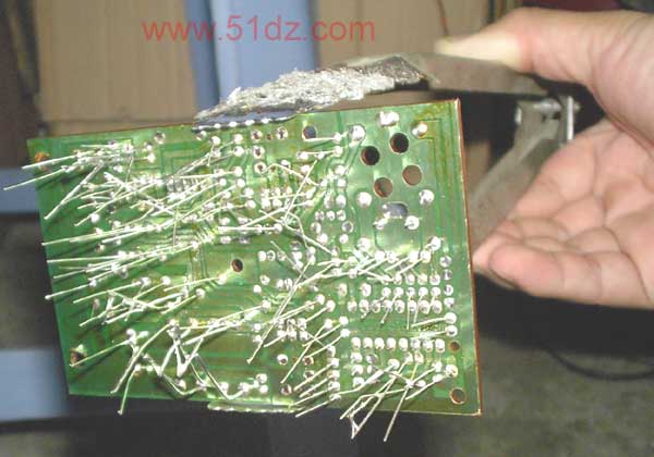 先用金属的夹子(卖馒头面包的几块钱的就可以用,没必要买专业的)夹住板先浸一个松香水,注意松香水不要打湿电路板正面。