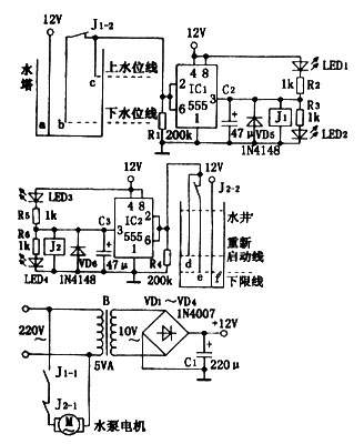 | 选择分类:当前分类——实用电路 相关联或者相类似的文章: 信号发生与频率测量09年技能大赛(1783) 数字电路循迹小车(1783) 十字旋转LED点阵套件制作说明(1783) 直流电机控制电路专辑(1783) 水位控制电路(898) 几种微型电机驱动电路实验和分析(884) 电话线路防盗报警器(865) 光电耦合器的应用(864) 节能型摩托车整流稳压器(860) 给彩电加装无线伴音发射装置(852) 电子灭蝇器(847) 利用TL431作大功率可调稳压电源(805) 电话转呼器(801) 论电视机代替万用表、示波器的可行性(794) 红外接收头的构造(770) 40kHZ超声波收发电路集锦(756) LM567集成电路的应用 (749) 金属接近开关(746) 单运放构成的单稳延时电路(744) 超声波测距精度的探讨(742) 首页 前页 后页 尾页 本站推荐: | 全保护型家用供水控制器 本文介绍的小型水塔水位控制器除有一般的水位自动控制外,还可防止因井中水位被抽至进水管端露出,而造成自控失灵,电动机不得停转等故障,非常适用于农村家庭中自建水塔从井中取水的供水系统。电路如图所示。 工作原理:220V交流电由电流变电压器B降压,VD1~VD4整流,C1滤波后得到12V左右直流电作为工作电源。IC1和IC2是两只555时基集成电路,分别用作水塔和水井的水位控制。 a、b、c是水塔中的三个电极,d、e、f是井中的三个电极。 ![]() 先假设水井中水量充足,J2-1为常闭状态。当水塔中水位低于下水位线时,a、b电极断开,IC1②、⑥脚为低电位吸合,J1-1闭合,水泵打水,J1-2断开b、c电极,同时发光二极管LED2发光,指示正处于上水状态。当水位升到上、下水位线之间时,因J1-2断开,电路工作状态不变,继续上水。当水位升至上水位线时,电极a、b由水电阻连通,IC1②、⑥脚电位升至2/3Vcc以上,③脚变为低电平,J1释放,J1-1使水泵停止,J1-2闭合,同时LED1发光,指示水塔处于放水状态。当水位放至上、下水位线之间时,因J1-2 闭合,故电路状态不变,水泵仍保持停止,直至水位降至下水位线以下时,电路再次按上述程序工作,如此循环往复,水塔中水位始终保持在上、下水位线之间。 上述工作过程是基于水井中水量充足的情况而言。然而,事实上,一般家用水井抽一次水远远不够将水塔打满,所以要保证自控正常必得有防水井水位过低装置。图中,当井中水位被抽低至下限线时。(此时进水管端尚未露出水面),电极e、f断开,IC2②、⑥脚电位低于1/3Vcc,③脚输出高电平,继电器J2吸合,J2-1切断水泵电机电源。J2-2断开d、e极,同时,LED4发光,指示井中为欠水状态。当井水渗水水位升至下限线以上、重新启动线以下时,因J2-2已断开,故电路状态不变,J2保持吸合,水泵仍不工作,这样,防止了水位在下限线临界时的电机频繁动作。当井中水位渐渐增高到重新启动线时,电极d、f由水体接通,IC2②、⑥脚电位升至2/3Vcc以上,③脚输出低电平,J2释放,J2-1闭合,水泵又能自行重新启动。同时,LED3发光。当水位被抽水而降至两线之间时,因J2-2闭合,电路状态不变,J2保持在释放状态,水泵继续为允许工作状态。这样,就保证了井中水位始终不会低过下限,而保持了不塔中上水和放水的记忆功能。 图中,C2、C3可防止IC1和IC2输出翻转时继电器触点的临界抖动现象。 制作:IC1、IC2可用各种555时基集成电路。由于一般家用水泵功率不大,所以J1、J2可用JQX—4F等12V直流继电器,空余的相同触点可并联使用。LED1—LED4可用不同颜色的高亮度发光二极管。电极b、c、d、e可用不锈钢丝制作。由于进、出水管由水泵连成一体与水常通,所以,可将电源正极接于水管作为a、f极。由于变压器长期通电,故应选用发热量小的良品。电路无需调试。 1、 本站不保证以上观点正确,就算是本站原创作品,本站也不保证内容正确。 2、如果您拥有本文版权,并且不想在本站转载,请书面通知本站立即删除并且向您公开道歉! |