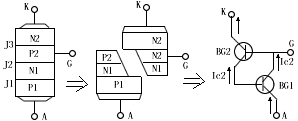图1、可控硅结构示意图和符号图 工作原理