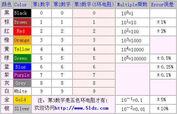 每条色环表示的意义(见表),色环表格左边第一条色环表示第一位数字,第2个色环表示第