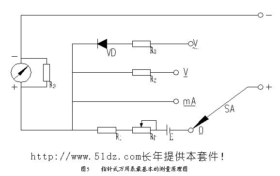 它由表头、电阻测量档、电流测量档、直流电压测量档和交流电压测量档几个部分组成,图中-"为黑表棒插孔,+"为红表棒插孔。 测电压和电流时,外部有电流通入表头,因此不须内接电池。 当我们把档位开关旋钮SA打到交流电压档时,通过二极管VD整流,电阻R3限流,由表头显示出来; 当打到直流电压档时不须二极管整流,仅须电阻R2限流,表头即可显示; 打到直流电档档时既不须二极管整流,也不须电阻R2限流,表头即可显示; 测电阻时将转换开关SA拨到Ω"档,这时外部没有电流通入,因此必须使用内部电池作为电源,设外接的被测电阻为Rx,表内的总电阻为R,形成的电流为I,由 Rx、电池E、可调电位器RP、固定电阻R1和表头部分组成闭合电路,形成的电流I使表头的指针偏转。红表棒与电池的负极相连,通过电池的正极与电位器 RP及固定电阻R1相连,经过表头接到黑表棒与被测电阻 Rx形成回路产生电流使表头显示。回路中的电流为: