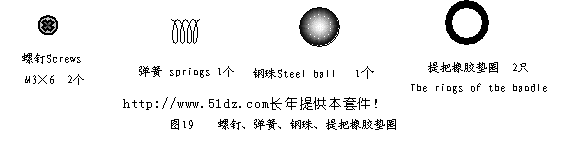 7.10 螺钉、弹簧、钢珠、提把橡胶垫圈(见图19)。 螺钉M3×6表示螺钉的螺纹部分直径为3mm,长度为6mm。