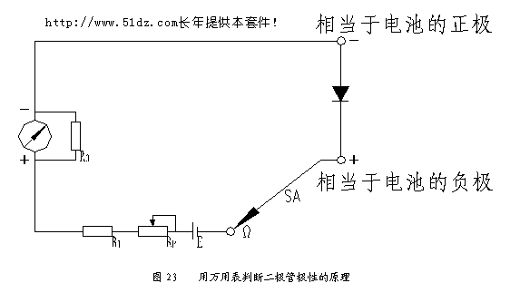表示二极管与黑表棒连接的为正极,与红表棒连接的为负极,与实物相对照,黑色的一头为正极,白色的一头为负极,也就是说阻值很小时,与黑表棒搭接的时二极管的黑头,反之,如果显示阻值很大,那么与红表棒搭接的时二极管的正极。 8.1.1 用万用表判断二极管极性的原理 用万用表判断二极管极性的原理(见图23),由于电阻档中的电池正极与黑表棒相连,这时黑表棒相当于电池的正极,红表棒与电池的负极相连,相当于电池的负极,因此当二极管正极与黑表棒连通,负极与红表棒连通时,二极管两端被加上了正向电压,二极管导通,显示阻值很小。