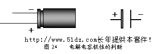 8.2 电解电容极性的判断 注意观察在电解电容侧面有-",是负极,如果电解电容上没有标明正负极,也可以根据它引脚的长短来判断,长脚为正极,短脚为负极(见图24)。