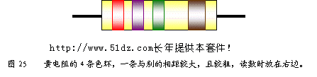 如果,已经把引脚剪短,并且电容上没有标明正负极,那么可以用万用表来判断,判断的方法是正接时漏电流小(阻值大),反接时漏电流大。 8.3 色环的认识 从材料袋中取出一黄电阻,注意别的东西不要丢失,封好塑料袋的封口。对照幻灯片观察,看它有几条色环,黄电阻有4条色环(见图25),其中有一条色环与别的色环间相距较大,且色环较粗,读数时应将其放在右边。