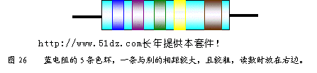 2个数字,第3个色环表示乘数,第4个色环也就是离开较远并且较粗的色环,表示误差。由此可知,图25中的色环为红、紫、绿、棕,阻值为27×105Ω=2.7MΩ,其误差为±0.5%。 将所取电阻对照表格进行读数,比如说,第一个色环为绿色,表示5,第2个色环为蓝色表示6,第3个色环为黑色表示乘100,第4个色环为红色,那么表示它的阻值是56×100=56Ω误差为±2%,对照材料配套清单电阻栏目R19=56Ω。 请同学练习试读,对照材料配套清单,检查读出的阻值是否正确。 蓝色或绿色的电阻(见图26),与黄电阻相似,首先找出表示误差的,比较粗的,而且间距较