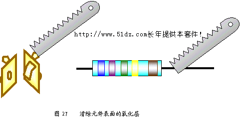 9 焊接前的准备工作 9.1 清除元件表面的氧化层 元件经过长期存放,会在元件表面形成氧化层,不但使元件难以焊接,而且影响焊接质量,因此当元件表面存在氧化层时,应首先清除元件表面的氧化层。注意用力不能过猛,以免使元件引脚受伤或折断。