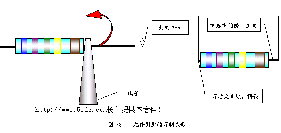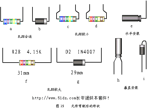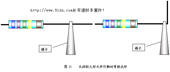 有的元件安装孔距离较大,应根据线路板上对应的孔距弯曲成形(见图31)。