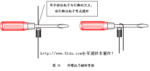 距较小,元件较大,应将引脚往回弯折成形(见图29中c、d)。电容的引脚可以弯成直角,将电容水平安装(见图29中e),或弯成梯形,将电容垂直安装(见图29中h)。 二极管可以水平安装,当孔距很小时应垂直安装(见图29中i),为了将二极管的引脚弯成美观的圆形,应用螺丝刀辅助弯制(见图30)。将螺丝刀紧靠二极管引脚的根部,十字交叉,左手捏紧交叉点,右手食指将引脚向下弯,直到两引脚平行。
