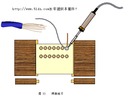 电阻为什么用色环表示,而不直接用数字表示? 电阻的阻值有色标法和直标法两种,色标法就是用色环表示阻值,它在元件弯制时不必考虑阻值所标的位置,当元件体积很小时,一般采用色标,如果采用直标,会使读数发生困难。一般直标法用于体积较大的电阻。 用直标法标注的电阻、二极管等弯制时应注意将标注的文字放在能看到的地方,便于今后维修更换。 9.3 焊接练习 焊接前一定要注意,烙铁的插头必须插在右手的插座上,不能插在靠左手的插座上;如果是左撇子就插在左手。烙铁通电前应将烙铁的电线拉直并检查电线的绝缘层是否有损坏,不能使电线缠在手上。通电后应将电烙铁插在烙铁架中,并检查烙铁头是否会碰到电线、书包或其他易燃物品。 烙铁加热过程中及加热后都不能用手触摸烙铁的发热金属部分,以免烫伤或触电。 烙铁架上的海棉要事先加水。 9.3.1 烙铁头的保护 为了便于使用,烙铁在每次使用后都要进行维修,将烙铁头上的黑色氧化层锉去,露出铜的本色,在烙铁加热的过程中要注意观察烙铁头表面的颜色变化,随着颜色的变深,烙铁的温度渐渐升高,这时要及时把焊锡丝点到烙铁头上,焊锡丝在一定温度时熔化,将烙铁头镀锡,保护烙铁头,镀锡后的烙铁头为白色。 9.3.2 烙铁头上多余锡的处理 如果烙铁头上挂有很多的锡,不易焊接,可在烙铁架中带水的海棉上或者在烙铁架的钢丝上抹去多余的锡。不可在工作台或者其他地方抹去。 9.3.3 在练习板上焊接 焊接练习板是一块焊盘排列整齐的线路板,学生将一根七股多芯电线的线芯剥出,把一股从焊接练习板的小孔中插入,练习板放在焊接木架上,从右上角开始,排列整齐,进行焊接(见图33)。
