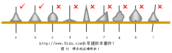 9.4 焊点的正确形状 焊点的正确形状(见图35),焊点a一般焊接比较牢固;焊点b为理想状态,一般不易焊出这样的形状;焊点c焊锡较多,当焊盘较小时,可能会出现这种情况,但是往往有虚焊的可能;焊点d,焊点d、e焊锡太少;焊点f提烙铁时方向不合适,造成焊点形状不规则;焊点g烙铁温度不够,焊点呈碎渣状,这种情况多数为虚焊;焊点h焊盘与焊点之间有缝隙为虚焊或接触不良;焊点I引脚放置歪斜。一般形状不正确的焊点,元件多数没有焊接牢固,一般为虚焊点,应重焊。
