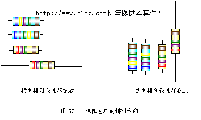 9.5 元器件的插放 将弯制成型的元器件对照图纸插放到线路板上。 注意:一定不能插错位置;二极管、电解电容要注意极性;电阻插放时要求读数方向排列整齐,横排的必须从左向右读,竖排的从下向上读,保证读数一致(见图37)。