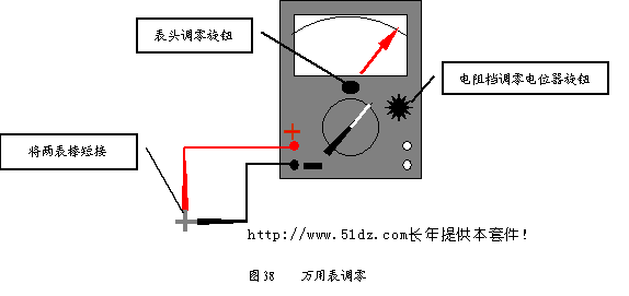 9.6 元器件参数的检测 每个元器件在焊接前都要用万用表检测其参数是否在规定的范围内。二极管、电解电容要检查它们的极性,电阻要测量阻值。 测量阻值时应将万用表的档位开关旋钮调整到电阻档,预读被测电阻的阻值,估计量程,将档位开关旋钮打到合适的量程,短接红黑表棒,调整电位器旋钮,将万用表调零(见图38)。注意电阻档调零电位器在表的右侧,不能调表头中间的小旋钮,该旋钮用于表头本身的调零。调零后,用万用表测量每个插放好的电阻的阻值。测量不同阻值的电阻时要使用不同的档位,每次换档后都要调零。为了保证测量的精度,要使测出的阻值在满刻度的2/3左右,过大或过小都会影响读数,应及时调整量程。要注意一定要先插放电阻,后测阻值,这样不但检查了电阻的阻值是否准确,而且同时还检查了元件的插放是否正确,如果插放前测量电阻,只能检查元件的阻值,而不能检查插放