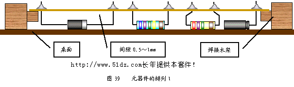 是否正确。 10 元器件的焊接 10.1 元器件的焊接 在焊接练习板上练习合格,对照图纸插放元器件,用万用表校验,检查每个元器件插放是否正确、整齐,二极管、电解电容极性是否正确,电阻读数的方向是否一致,全部合格后方可进行元器件的焊接。 焊接完后的元器件,要求排列整齐,高度一致(见图39)。为了保证焊接的整齐美观,焊接时应将线路板板架在焊接木架上焊接,两边架空的高度要一致,元件插好后,要调整位置,使它与桌面相接触,保证每个元件焊接高度一致。焊接时,电阻不能离开线路板太远,也不能紧贴线路板焊接,以免影响电阻的散热。