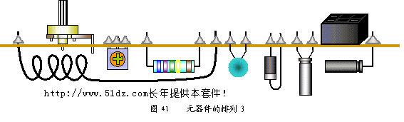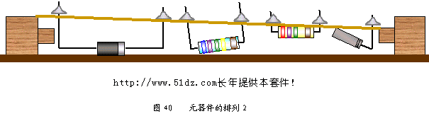 焊接时如果线路板未放水平(见图40),应重新加热调整。图中线路板未放水平,使二极管两端引脚长度不同,离开线路板太远;蓝电阻放置歪斜;电解电容折弯角度大于90˚,易将引脚弯断。