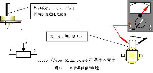 应先焊水平放置的元器件,后焊垂直放置的或体积较大的元器件,如分流器、可调电阻等(见图41)。 焊接时不允许用电烙铁运载焊锡丝,因为烙铁头的温度很高,焊锡在高温下会使助焊剂分解挥发,易造成虚焊等焊接缺陷。 10.2 错焊元件的拔除 当元件焊错时,要将错焊元件的拔除。先检查焊错的元件应该焊在什么位置,正确位置的引脚长度是多少,如果引脚较短,为了便于拔出,应先将引脚剪短。在烙铁架上清除烙铁头上的焊锡,将线路板绿色的焊接面朝下,用烙铁将元件脚上的锡尽量刮除,然后将线路板竖直放置,用镊子在黄色的面将元件引脚轻轻夹住,在绿色面,用烙铁轻轻烫,同时用镊子将元件向相反方向拔除。拔除后,焊盘孔容易堵塞,有两种方法可以解决这一问题。 烙铁稍烫焊盘,用镊子夹住一根废元件脚,将堵塞的孔通开; 将元件做成正确的形状,并将引脚剪到合适的长度,镊子夹住元件,放在被堵塞孔的背面,用烙铁在焊盘上加热,将元件推入焊盘孔中。 注意用力要轻,不能将焊盘推离线路板,使焊盘与线路板间形成间隙或者使焊盘与线路板脱开。 10.3 电位器的安装 电位器安装时,应先测量电位器引脚间的阻值,电位器共有五个引脚(见图42),其中三个并
