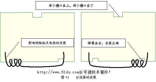 排的引脚中,1、3两点为固定触点,2为可动触点,当旋钮转动时,1、2或者2、3间的阻值发生变化。电位器实质上是一个滑线电阻,电位器的两个粗的引脚主要用于固定电位器。安装时应捏住电位器的外壳,平稳地插入,不应使某一个引脚受力过大。不能捏住电位器的引脚安装,以免损坏电位器。安装前应用万用表测量电位器的阻值,电位器1、3为固定触点,2为可动触点,1、3之间的阻值应为10kΩ,拧动电位器的黑色小旋钮,测量1与2或者2与3之间的阻值应在0~10kΩ间变化。如果没有阻值,或者阻值不改变,说明电位器已经损坏,不能安装,否则5个引脚焊接后,要更换电位器就非常困难。 注意电位器要装在线路板的焊接绿面,不能装在黄色面。 10.4 分流器的安装 安装分流器时要注意方向,不能让分流器影响线路板及其余电阻的安装(见图43)。
