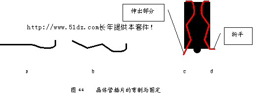 10.5 输入插管的安装 输入插管装在绿面,是用来插表棒的,因此一定要焊接牢固。将其插入线路板中,用尖嘴钳在黄面轻轻捏紧,将其固定,一定要注意垂直,然后将两个固定点焊接牢固。 10.6 晶体管插座的安装 晶体管插座装在线路板绿面,用于判断晶体管的极性。在绿面的左上角有6个椭圆的焊盘,中间有两个小孔,用于晶体管插座的定位,将其放入小孔中检查是否合适,如果小孔直径小于定位突起物,应用锥子稍微将孔扩大,使定位突起物能够插入。 将晶体管插片(见图44)插入晶体管插座中,检查是否松动,应将其拨出并将其弯成图44中b的形状,插入晶体管插座中(见图44中c),将其伸出部分折平(见图44中d)。