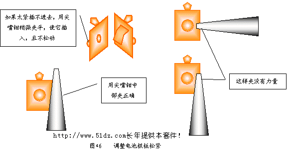 如果电刷轨道上粘了锡,应将其绿面朝下,用没有焊锡的烙铁将锡尽量刮除。但由于线路板上的金属与焊锡的亲和性强,一般不能刮尽,只能用小刀稍微修平整。 在每一个焊点加热的时间不能过长,否则会使焊盘脱开或脱离线路板。对焊点进行修整时,要让焊点有一定的冷却时间,否则不但会使焊盘脱开或脱离线路板,而且会使元器件温度过高而损坏。 10.8 电池极板的焊接 焊接前先要检查电池极板的松紧,如果太紧应将其调整。调整的方法是用尖嘴钳将电池极板侧面的突起物稍微夹平,使它能顺利地插入电池极板插座,且不松动(见图46)。
