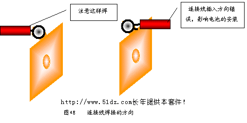 焊接时应将电池极板拨起,否则高温会把电池极板插座的塑料烫坏。为了便于焊接,应先用尖嘴钳的齿口将其焊接部位部分锉毛,去除氧化层。用加热的烙铁沾一些松香放在焊接点上,再加焊锡,为其搪锡。 将连接线线头剥出,如果是多股线应立即将其拧紧,然后沾松香并搪锡(提供的连接线已经搪锡)。用烙铁运载少量焊锡,烫开电池极板上已有的锡,迅速将连接线插入并移开烙铁。如果时间稍长将会使连接线的绝缘层烫化,影响其绝缘。 连接线焊接的方向(见图48)。连接线焊好后将电池极板压下,安装到位。